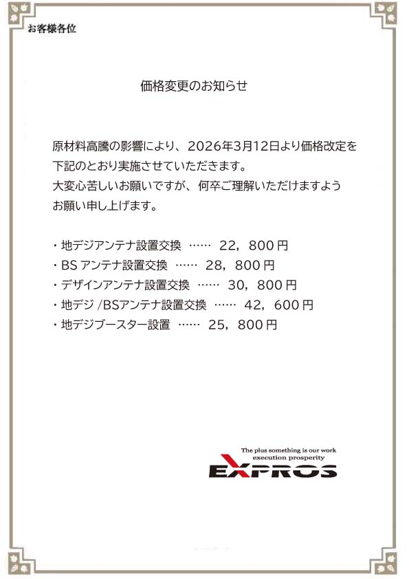 価格改定のお知らせ 2026年3月11日 « 前の記事へ 最近の投稿 価格改定のお知らせ 壁掛けテレビ設置工事 天井裏テレビ設備交換 三角屋根アンテナ設置工事 高所作業車でアンテナ工事 アーカイブ 2026年3月 2025年6月 カテゴリー お知らせ 施工事例 未分類